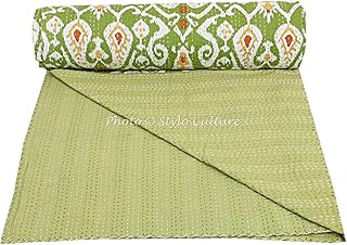 Stylo Culture 綿カンタブランケット スロークイーン ベッドスプレッド ベッドカバー パロットグリーン インディアン エスニック ハンドステッチ イカット プリント キルト ベッドカバー (90x108)