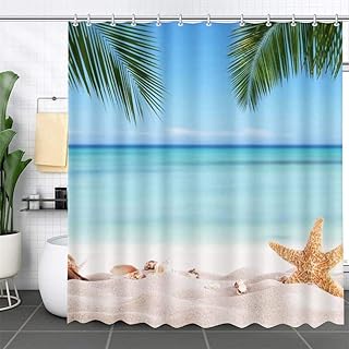 MEHOFOND 夏 ビーチ シャワーカーテン 貝殻 ヒトデ 砂 ヤシの葉 ビーチ テーマ シャワーカーテン 防水ポリエステル生地 シャワーカーテンセット フック付き バスルーム装飾 72インチx72インチ