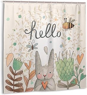 ラビットファームハウス シャワーカーテン かわいい漫画 グレーラビットとLove Say Hello シャワーカーテン カラフルな水彩 花の葉 かわいい動物の蝶 蜂 ベージュ バスカーテン 防水