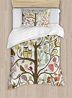 ヴィンテージ子供用布団カバーセットby Ambesonne、レトロスタイルツリー花でBugs and Bees Owl Birds Kids Toddlersアート印刷、装飾寝具セット枕、ブラウングレー TWIN / TWIN XL nev_13081_twin