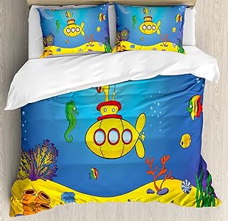 イエローサブマリン布団カバーセットby Ambesonne、子供Nauticalカラフルな魚Underwater jellyfish Seahorseシェルヒトデ、装飾寝具セット枕、ブルーイエロー FULL / QUEEN nev_22368_queen