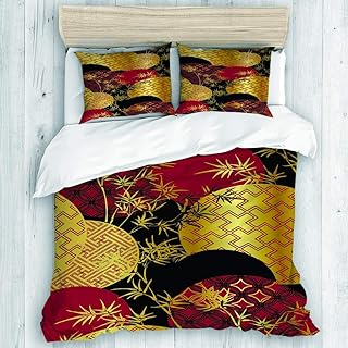 DOJOFELPM 布団カバーセット 掛け布団カバーセット ボックスシーツ 枕カバー,レッドブラックゴールドタケ植物日本中国語,高密度 カジュアル感 寝具カバー 寝具カバーセット (セミダブル・170X210cm)