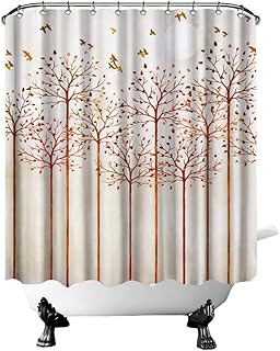 木 シャワーカーテン 秋の森の上を飛ぶ鳥 浴室カーテン 暖色 布地 ホームインテリア フック付き 72インチ×72インチ ブラウン